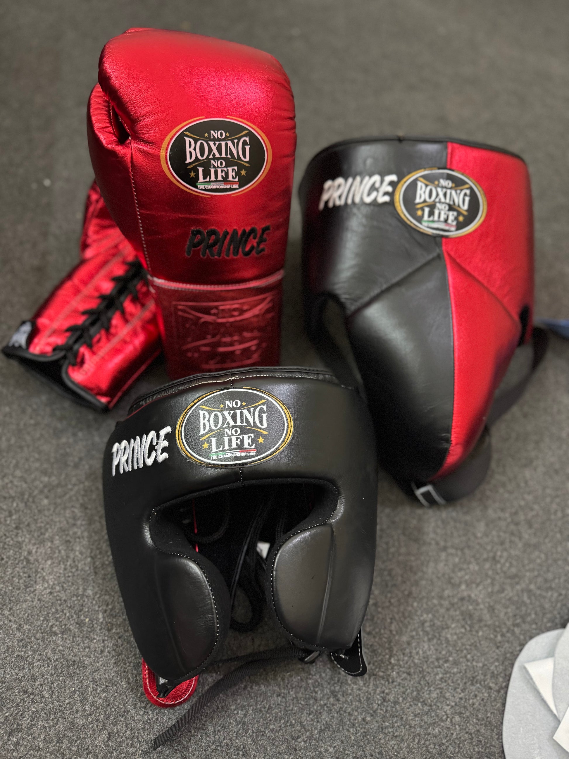 Transform your training sessions with the Custom Handmade Boxing Sparring Kit in striking metallic red and black. Designed for serious boxers and fitness enthusiasts alike, this premium kit embodies the spirit of the mantra "No Boxing No Life." Get ready to elevate your performance and style in the ring.